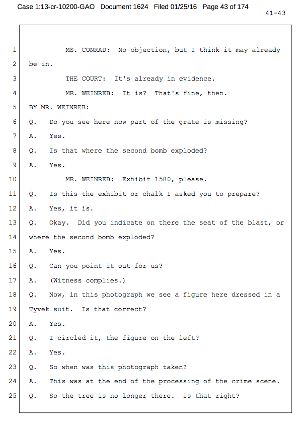 This is the transcript of the testimony of FBI photographer Michelle Gamble, including initial sidebar, direct examination, cross examination, re-direct examination, and re-cross examination. It was released on April 26, 2016, as part of the trial transcript of March 30, 2015.